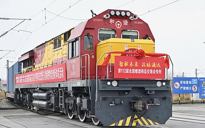 隨后,伴隨汽笛長鳴,一列從荷蘭蒂爾堡出發(fā)滿載德國葡萄酒、法國奶酪、比利時巧克力等進(jìn)口糖酒商品的“糖酒會專列”緩緩駛?cè)氤啥艰F路集裝箱中心站。與去年首發(fā)專列“站到站”運(yùn)輸模式不同,此次專列以“高效、穩(wěn)定、低成本”全冷鏈運(yùn)輸?shù)奈锪鲀?yōu)勢為海外展商提供“門到門”全鏈條服務(wù),實(shí)現(xiàn)從歐洲工廠至糖酒會展場全程運(yùn)輸無縫銜接,助力展商“零延時”參展。